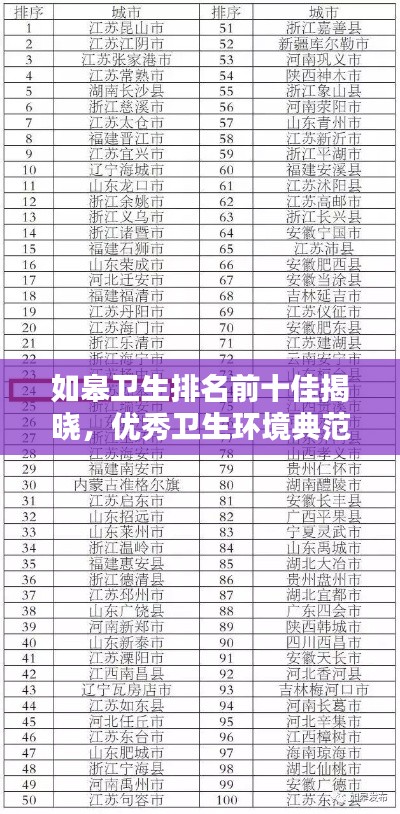 如皋市是江苏省的一颗璀璨明珠,以其独特的地理位置、丰富的历史文化和繁荣的经济发展而闻名,近年来,如皋市的卫生环境也备受瞩目,其在卫生排名中跻身前列,其中前十名的卫生表现尤为突出,本文将为您揭示如皋卫生排名前十名的相关情况,展示优秀卫生环境的典范。